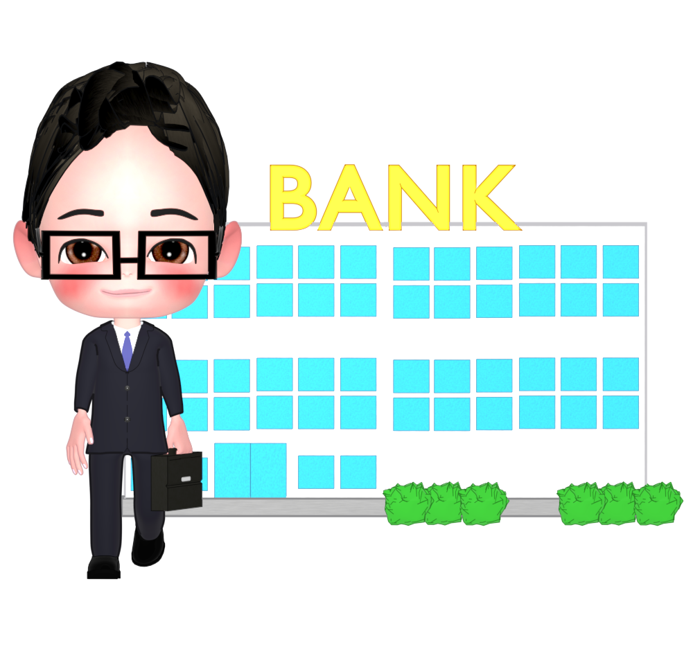 スポンサーリンク スポンサーリンク 銀行員のイラスト お金 2025.10.04 金融商品に関する、あらゆるお仕事をしている銀行員の男性です。 銀行では主に、「窓口業務・預金業務・貸付業務(融資業務)・為替業務・国債」などの債券に関する売買業務があります。