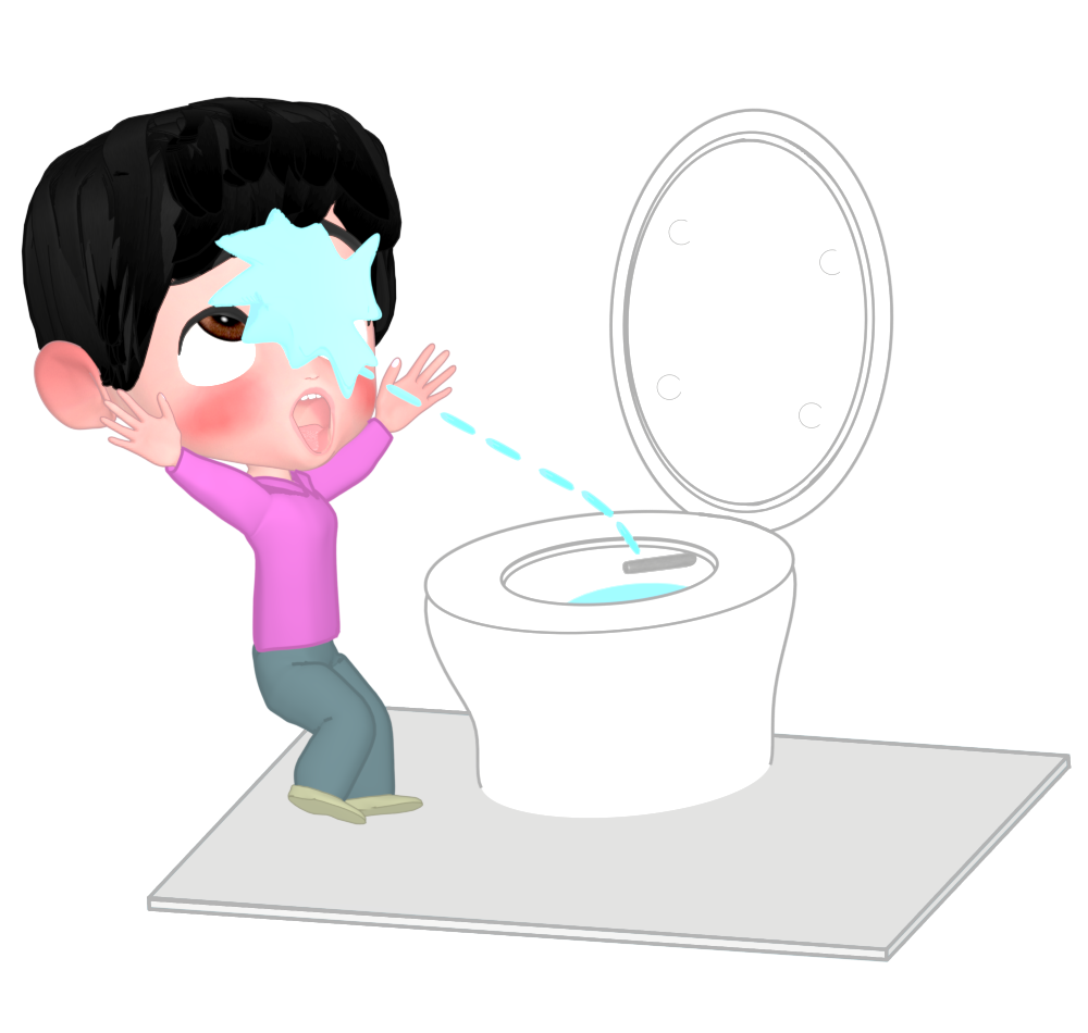 スポンサーリンク スポンサーリンク 温水洗浄便座の水が顔にかかる人のイラスト 人物 2025.10.16 「うわっ!」おしりを洗うトイレのシャワーが正常に動作をするか確認をしているところ、思ったよりも勢いよく飛び、顔面に水がかかっている人の様子です。 便器の種類によっては、おしりを洗うシャワーのほかにも女性用ビデ洗浄機能があります。どちらも清潔さを保つために開発されたものです。