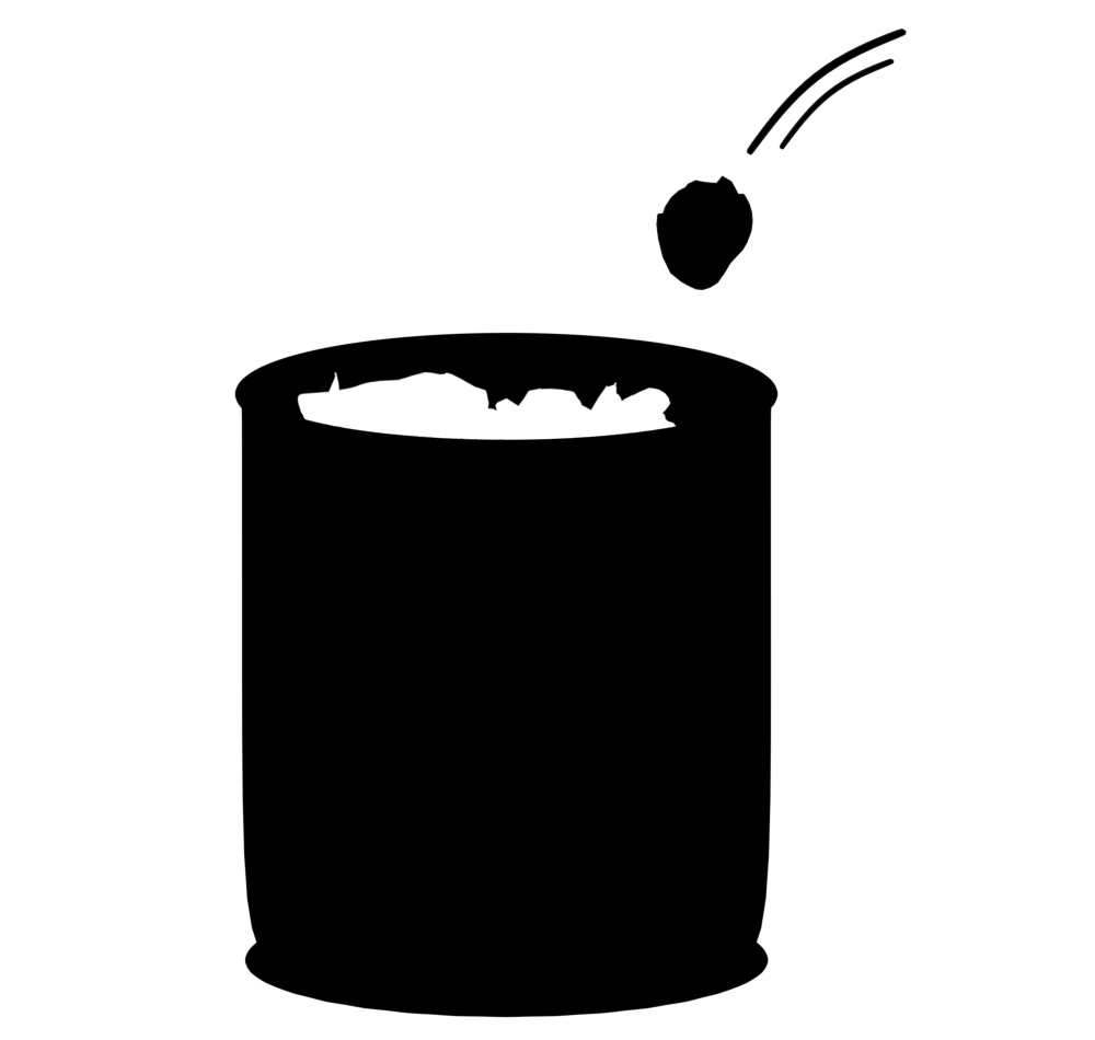 入れ物にくずがたくさんたまっている、ゴミ箱の白黒シルエット素材です。
